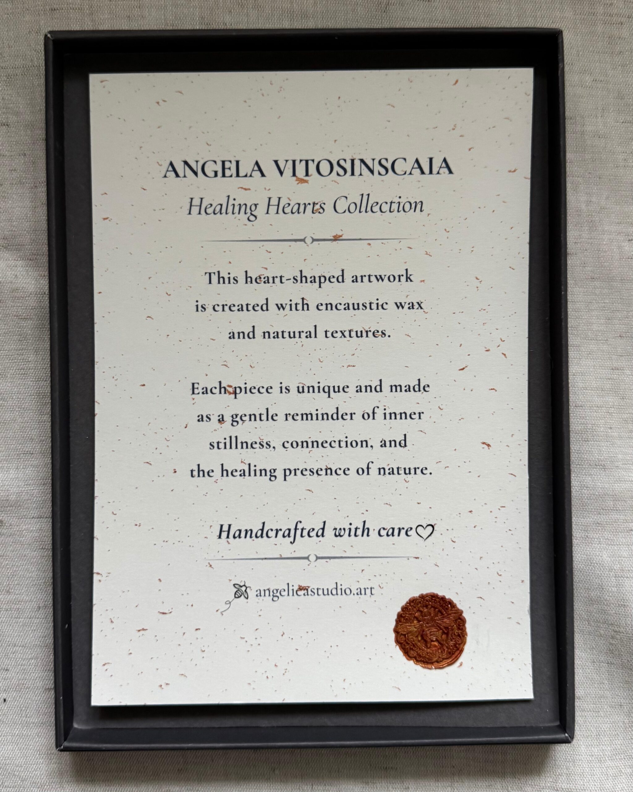 Tags art gift idea, art inspired by nature, artisan gift, boho decor, botanical art, calming art, contemporary encaustic, emotional art, encaustic art, encaustic artist UK, encaustic wax, handmade art, handmade gift, healing art, Healing heart, heart ornament, heart wall art, home decor art, meditation art, mindfulness art, Mixed Media Art, modern abstract painting, Nature-Inspired Art, one of a kind art, silent strength art, slow art, small art gift, soulful art, spiritual art, tactile art, textured art, textured painting, wall hanging art, wellness art