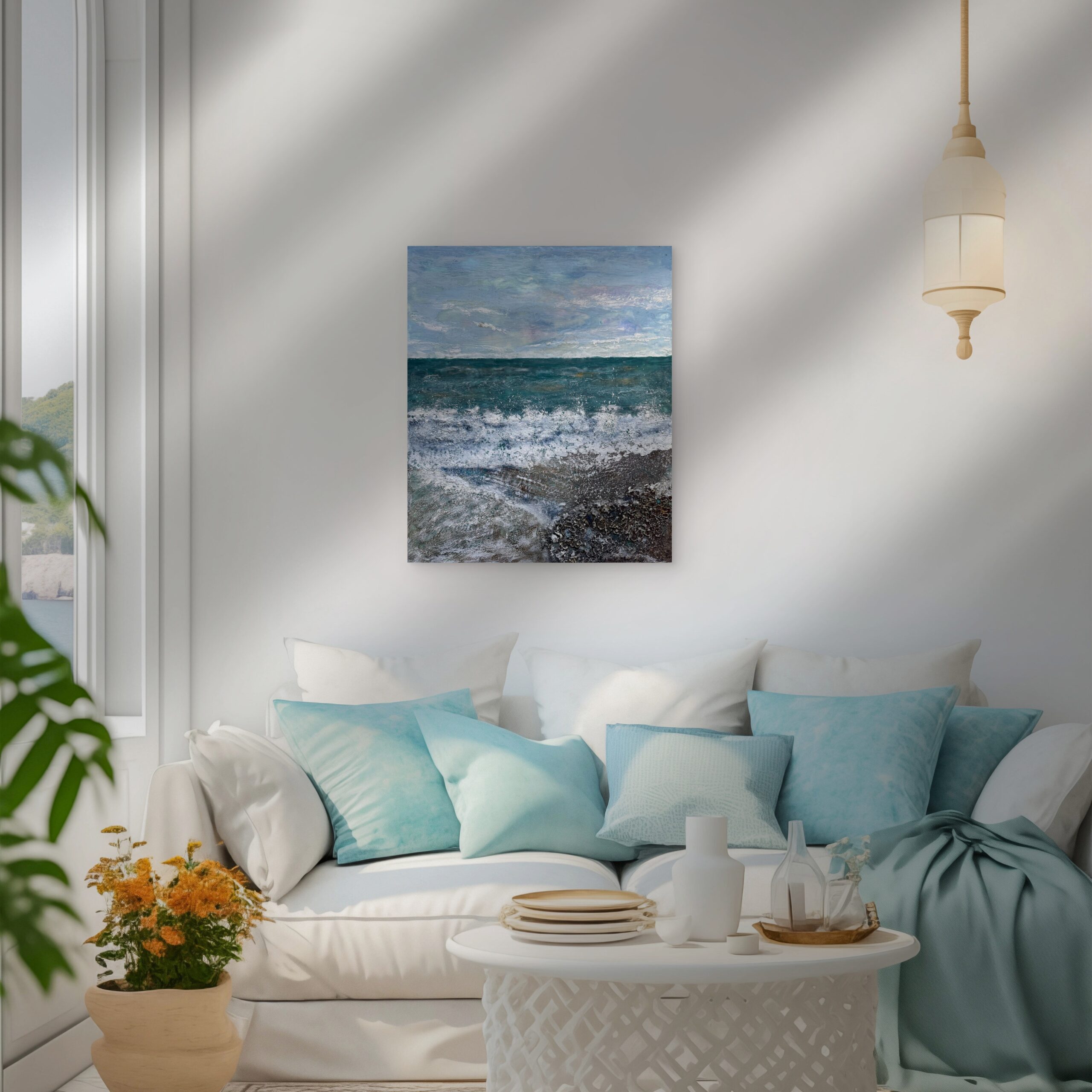 “Eternal Horizon” brings the soothing energy of the sea into your home with this original encaustic seascape painting. Created using the ancient art of encaustic wax painting, this artwork captures the movement of ocean waves, the depth of the coastal horizon, and the timeless rhythm of the sea.