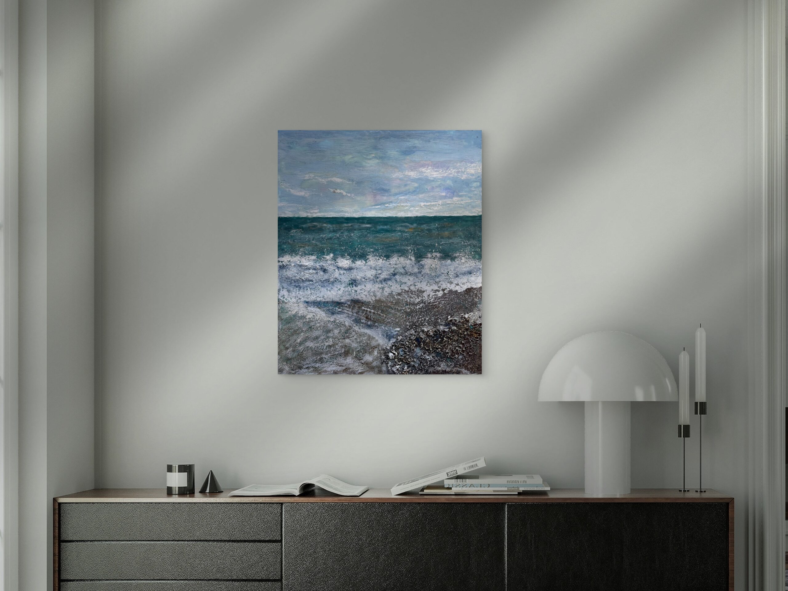 The textured layers of melted beeswax and pigments create a unique shimmering surface that shifts beautifully with the light, making the artwork feel alive—just like the ocean itself.