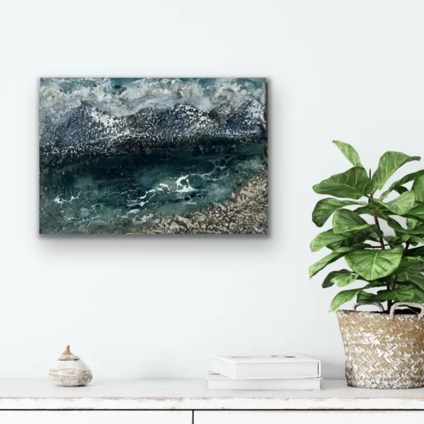 Immerse yourself in the raw beauty of the ocean with this encaustic painting, featuring a dramatic aerial view of waves crashing against rocks, sea foam swirling, and icy formations.