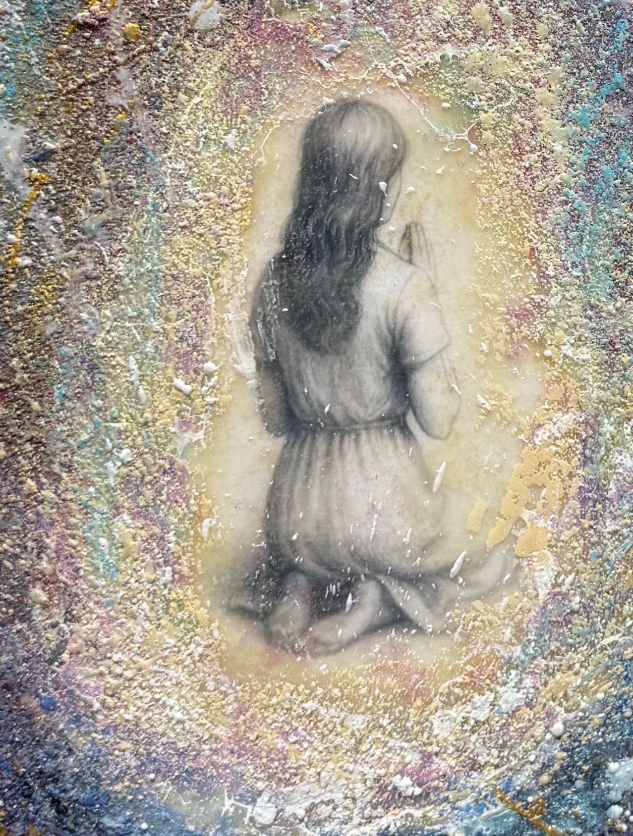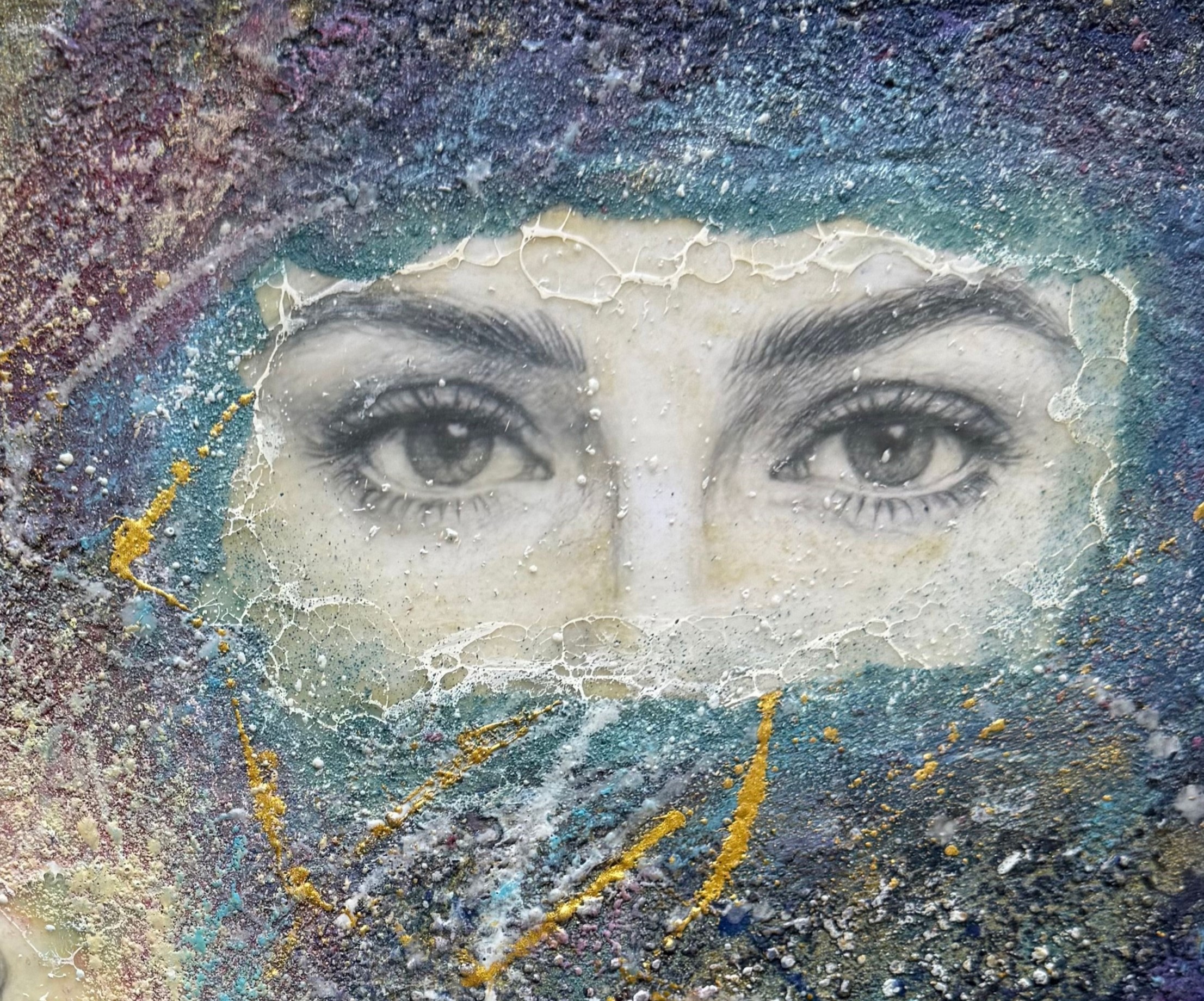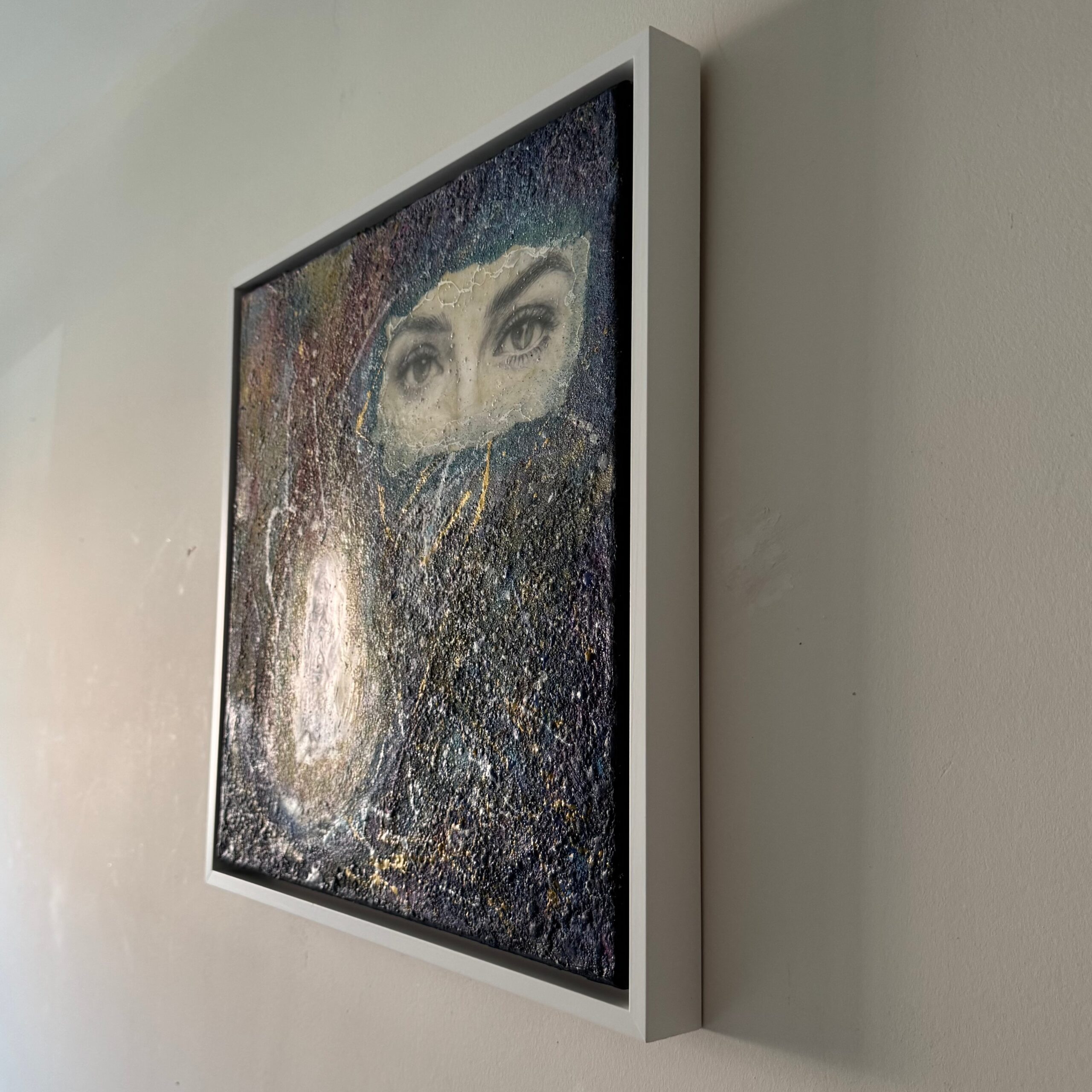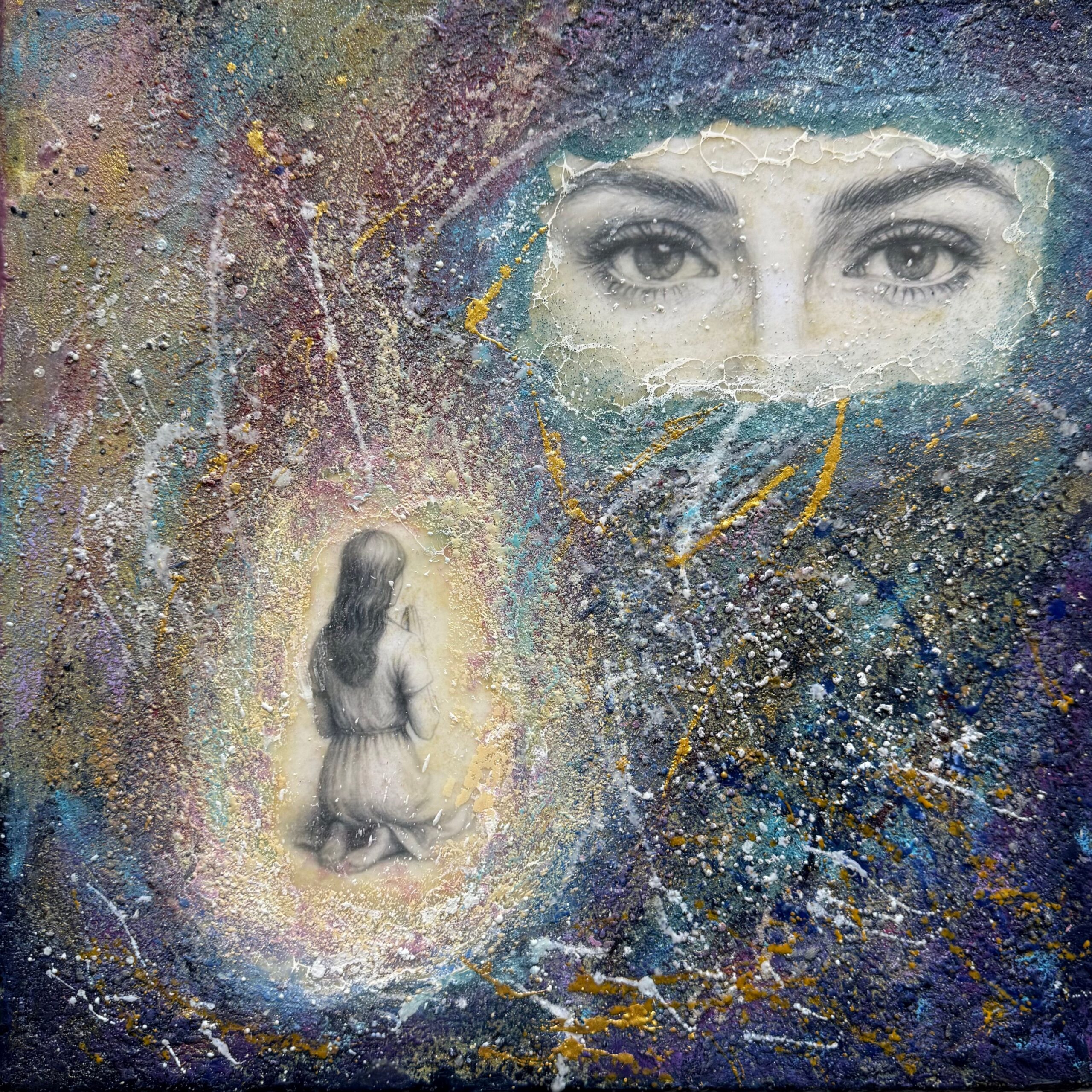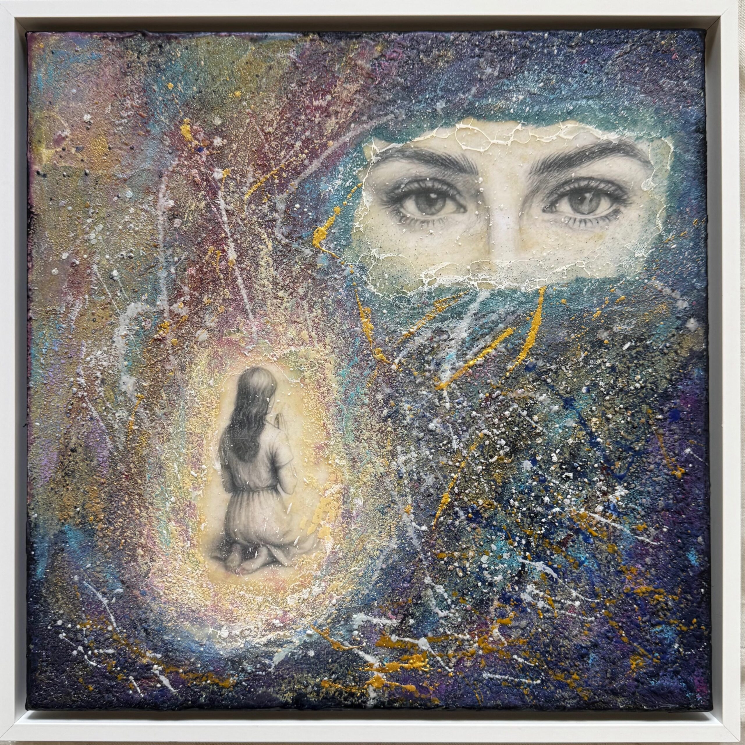 “Within the light” A child kneels within a halo of light, fragile yet timeless, while above, watchful eyes emerge from the cosmos. Layers of encaustic wax and colour evoke memory, dreams, and the unseen ties between past and present. This painting is a meditation on the inner child — a reminder that innocence endures, witnessed and protected by the deeper self.